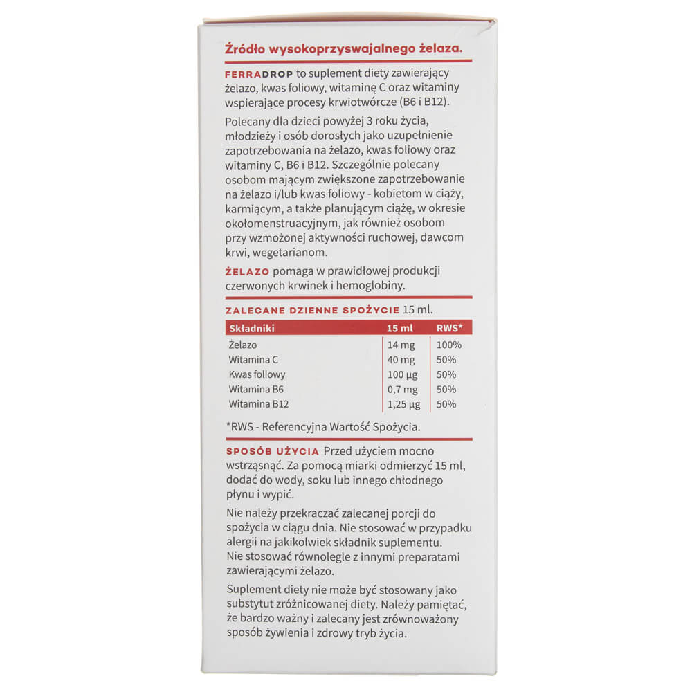 Ferradrop yra maisto papildas iš Aura Herbals, kurio sudėtyje yra geležies + vitamino C + vitamino B6, B9 ir B12. Ypatingos geležies savybės palaiko tinkamą raudonųjų kraujo kūnelių ir hemoglobino gamybą palaiko teisingą imuninės sistemos veiklą padeda palaikyti teisingas pažinimo funkcijas mažina nuovargio ir pavargimo jausmą Ypatingos folio rūgšties savybės (vitaminas B9) foliatai palaiko teisingą imuninės sistemos veiklą foliatai padeda užtikrinti teisingą kraujo gamybą foliatai prisideda prie motinos audinių augimo nėštumo metu foliatai dalyvauja ląstelių dalijimosi procese