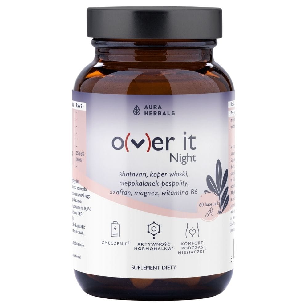 Aura Herbals Over It Night yra maisto papildas kapsulių pavidalu. Augalų ekstraktų šaltinis iš skaistmedžio, šafrano, šatavario, ir pankolio. Sudėtis praturtinta magnio ir vitamino B6 (Quali ® -B).
