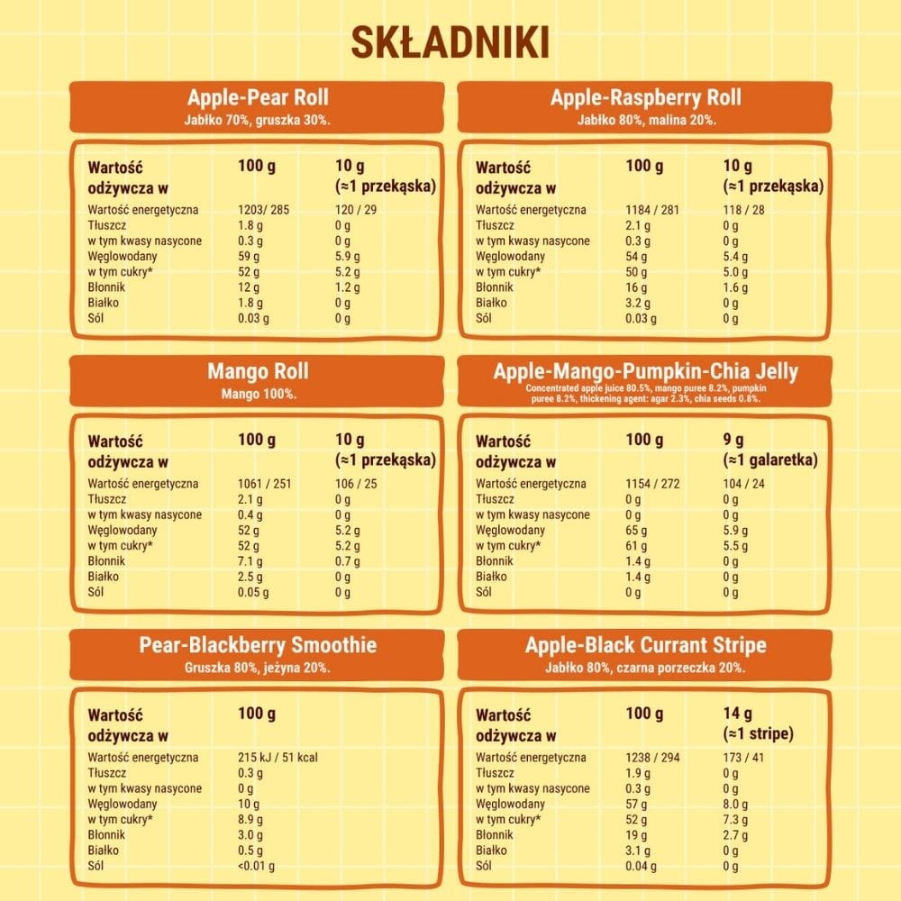 - Vaisių užkandžių rinkinys – 100% tikrų vaisių be pridėto cukraus, konservantų, glitimo, ar dažiklių.