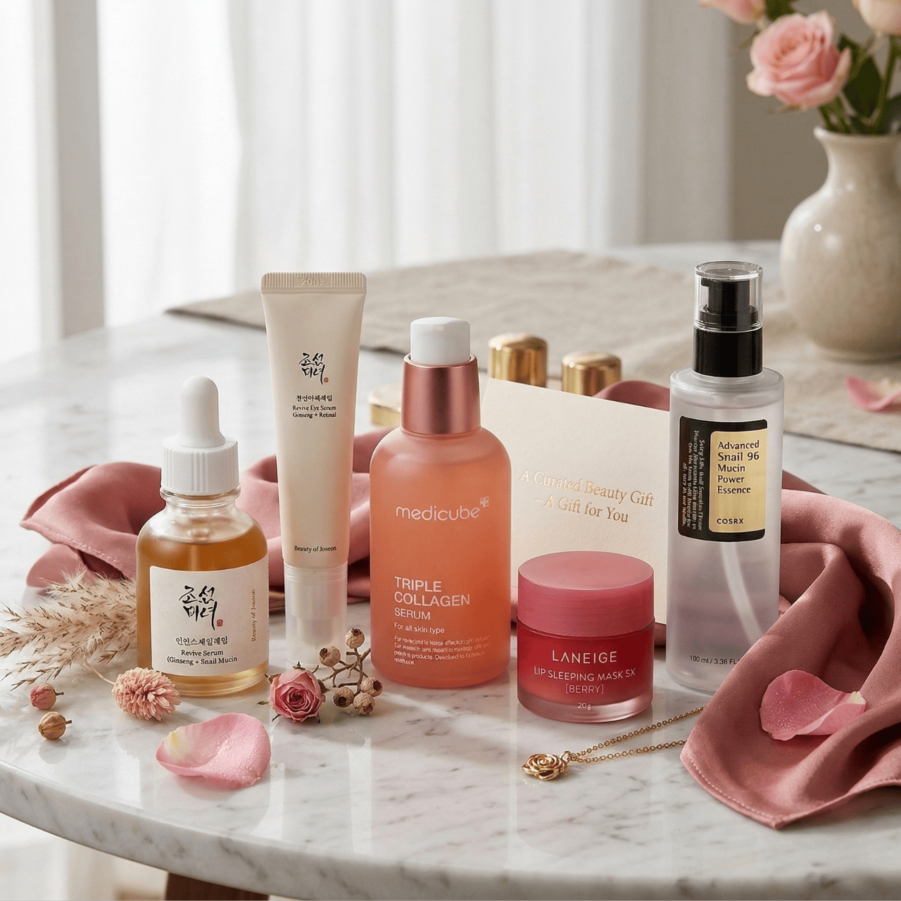 The K-Beauty Anti-Aging Gift Set brings together five high-performance skincare essentials powered by snail mucin, ginseng, marine collagen and peptides – some of the most celebrated ingredients in Korean beauty. This curated evening ritual targets the visible signs of ageing, restoring firmness, radiance and deep hydration to mature skin.