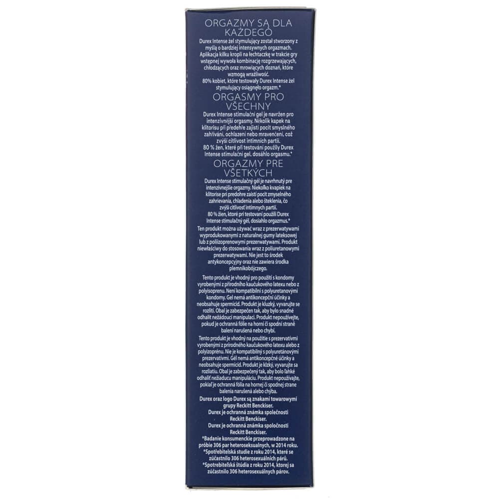 Intensyviai orgazmą stimuliuojantis gelis Durex gali būti puikus seksualinis praturtinimas abiem partneriams, nors jis skirtas moterims. Dėl intensyvesnių pojūčių, kuriuos gali patirti moteris, lytinis aktas suteikia daug daugiau pasitenkinimo ir kitai pusei. Tai įdomus produktas ir dėl to, kad gelis leidžia pasiekti daug trumpesnį laiką, reikalingą maksimaliam partnerės pasitenkinimui pasiekti. Intense Orgasmic taip pat gali būti naudojamas kaip klasikinis drėkinamasis gelis, kuris veiksmingai sprendžia makšties sausumo problemą. Tai saugus, malonios tekstūros, produktas, kuris užtikrins tinkamą ir optimalų intymios srities drėkinimą ir užkirs kelią galimam sudirgimui. Dėl jo lytiniai santykiai gali būti daug malonesni - todėl tikrai verta išbandyti šį konkretų produktą ir įsitikinti savo akimis. Be to, verta paminėti ir tai, kad jį lengva naudoti patogia pompa. Užtepamo gelio kiekį galima reguliuoti pagal savo pageidavimus.