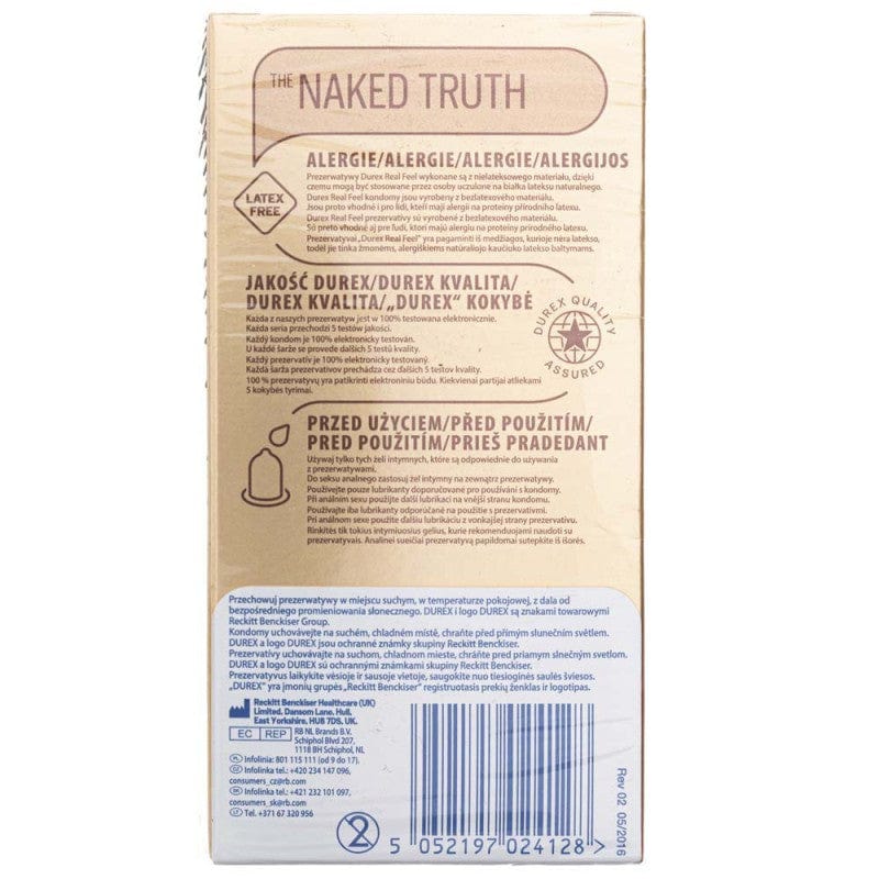Durex "Real Feel" prezervatyvai pagaminti iš nelateksinio poliizopreno, kuris pasižymi didesniu elastingumu nei natūralus kaučiuko lateksas ir yra minkštesnis, todėl juos patogiau naudoti ir jie geriau priglunda. Galite jaustis taip, tarsi nedėvėtumėte prezervatyvo. Sukurti taip, kad jaustumėte odos ant odos pojūtį.