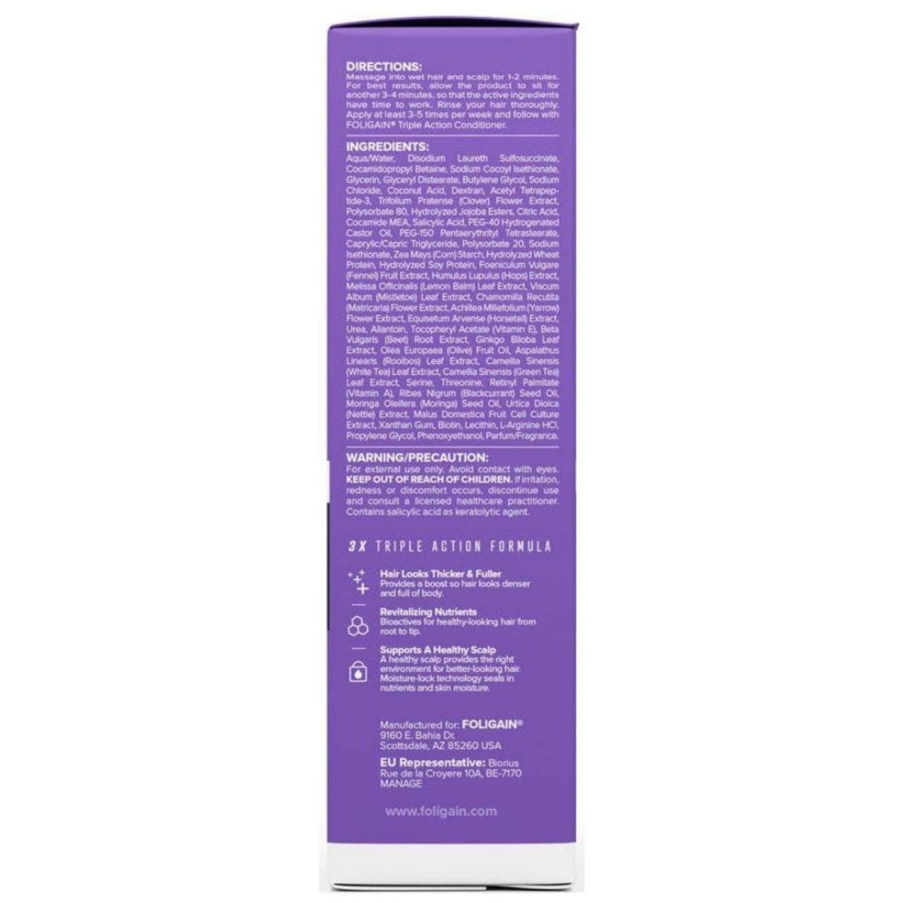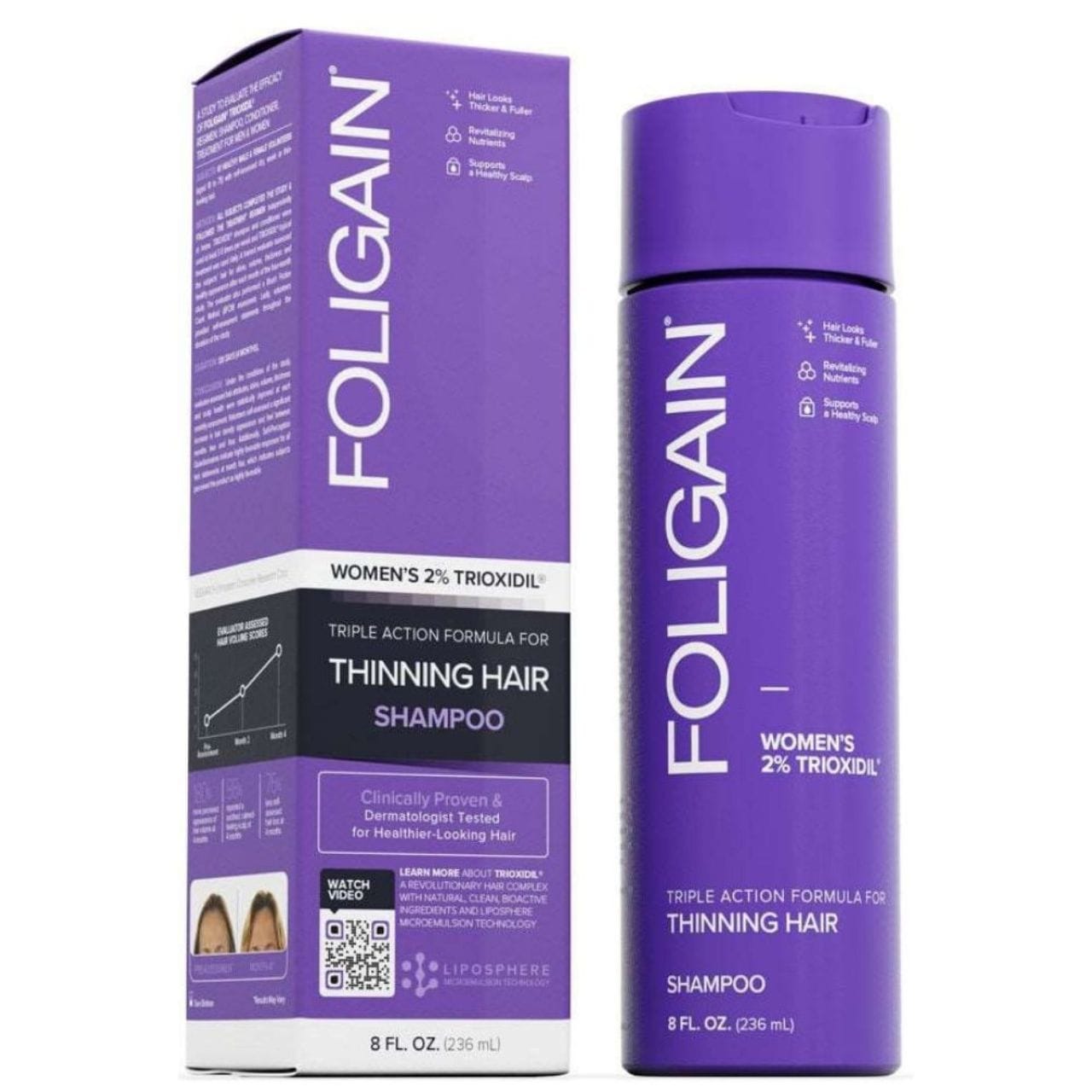 FOLIGAIN trigubo veikimo šampūnas retėjantiems moterų plaukams su 2% trioksidilo yra atgaivinančio poveikio šampūnas, kuris veiksmingai didina plaukų tankumą ir mažina plaukų slinkimą. Klinikiniais tyrimais įrodyta formulė per 4 mėnesius padidina plaukų apimtį iki 180%, tuo pačiu maitindama galvos odą ir stiprindama plaukų folikulus.