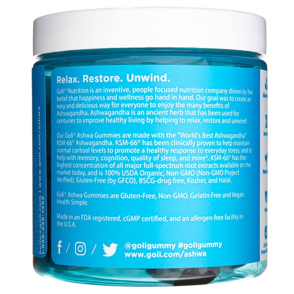 „Ashwagandha“ gaminamas „Goli Nutrition“ yra maisto papildas, kurio sudėtyje yra mišrių uogų skonio želė saldainių su „Ashwagandha KSM-66“ ® šaknų ekstraktu. Formulė taip pat praturtinta vitaminu D2.