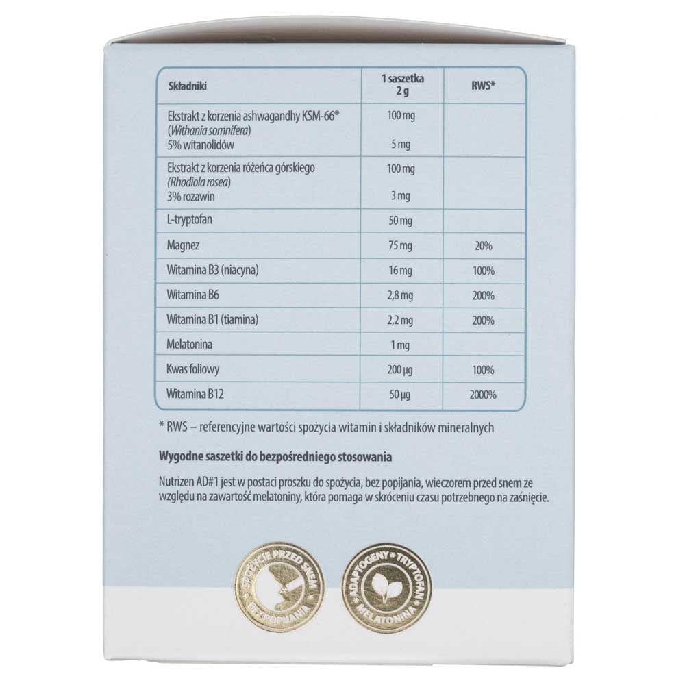 Nutrizen AD 1 yra maisto papildas, kurio sudėtyje yra kruopščiai atrinktas adaptogenų kompleksas, praturtintas B grupės vitaminais ir magniu, padedantis palaikyti normalias psichologines funkcijas, greičiau užmigti ir sumažinti nuovargio jausmą.