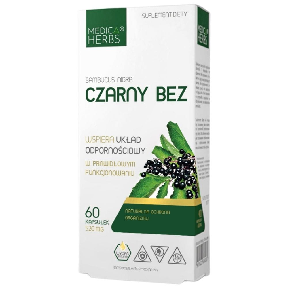 Medica Herbs Juodojo šeivamedžio uogos yra maisto papildas kapsulėse. Juodojo šeivamedžio uogų ekstrakto šaltinis , standartizuotas, kad jame būtų 5% antocianidinų. Jame yra 520 mg ekstrakto, įskaitant 26 mg antocianidinų.