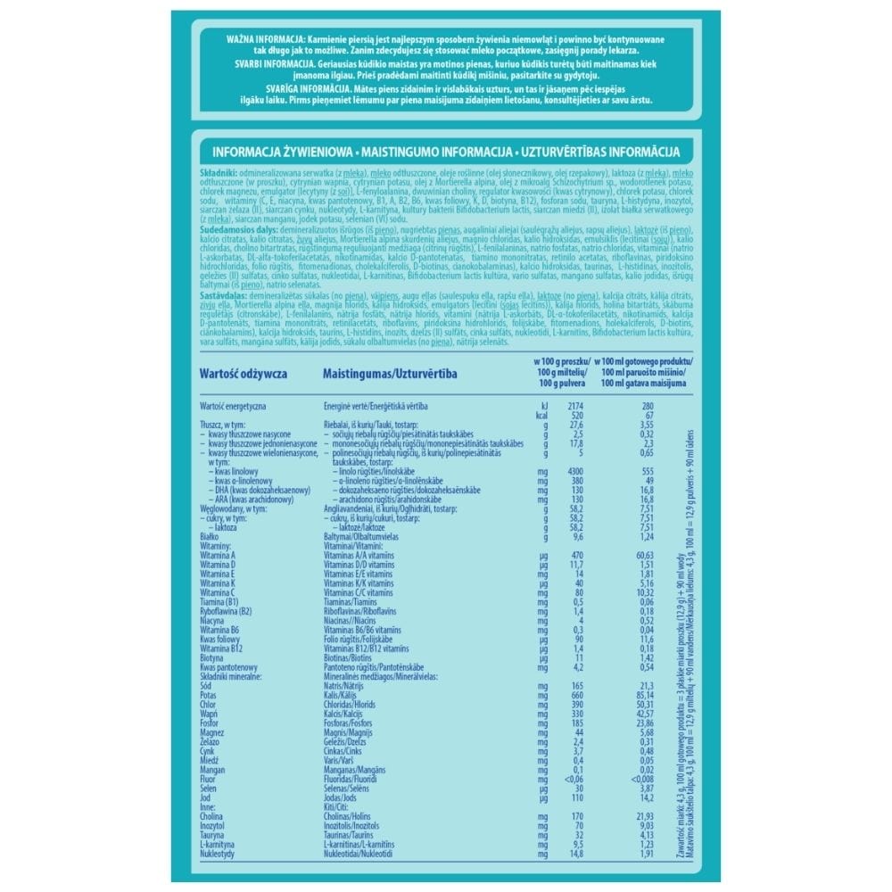 Demineralizuota iš pieno gauta išrūga (iš pieno), nugriebto pieno, augaliniai aliejai (saulėgrąžų aliejus, rapsų aliejus), laktozė (iš pieno), kalcio citratas, kalio citratas, žuvų taukai, Mortierella Alpi na aliejus, magnio chloridas, kalio hidroksidas, emulsiklis (lecitinai (iš sojos)), kalio chloridas, cholino bitartratas, rūgštingumą reguliuojanti medžiaga (citrinų rūgštis), L-fenilalaninas, natrio fosfatas, natrio chloridas, vitaminai (C, E, niacinas, pantoteno rūgštis, B1, A, B2, B6, folio rūgštis, K, D, biotinas, B12), kalcio hidroksidas, taurinas, L-histidinas, inozitolis, geležis (II) sulfatas, cinko sulfatas, nukleotidai, L-karnitinas, Bifidobacterium lactis bakterijų kultūros, varis (II) sulfatas, mangano sulfatas, kalio jodidas, iš pieno gautas išrūgų baltymas (), natrio selenatas (VI).