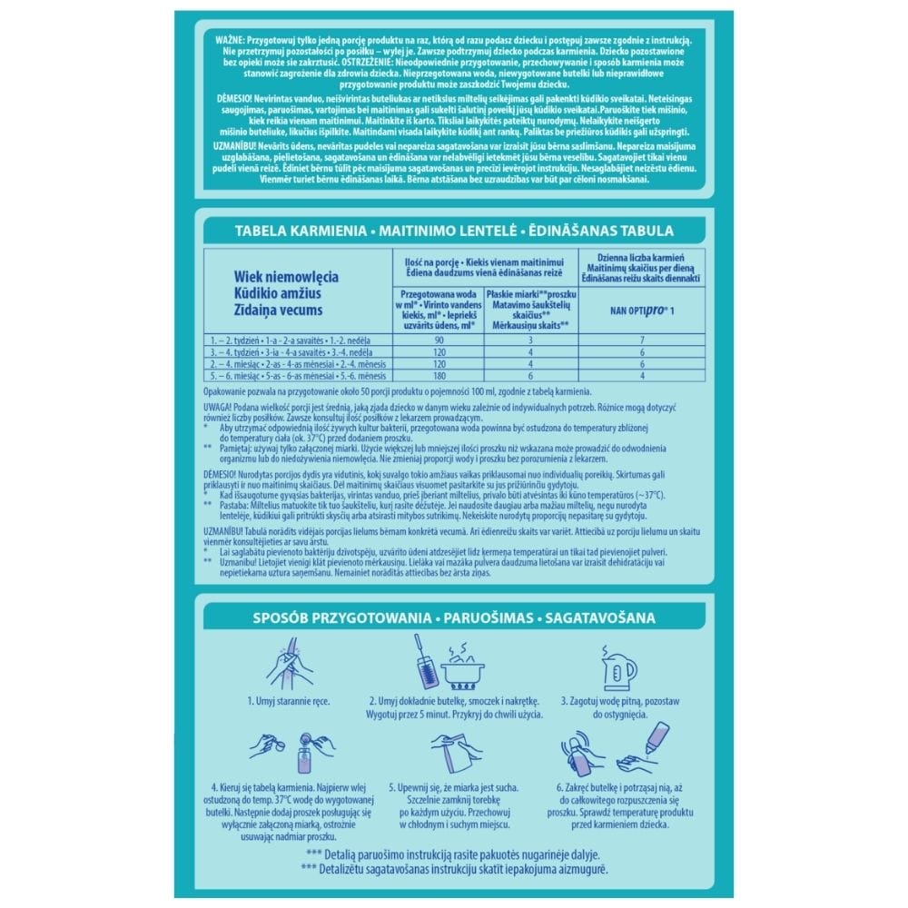 NAN OPTIpro 1 yra pradinis pienas , specialiai sukurtas kūdikių poreikiams nuo pirmos dienos. Tinka kaip motinos pieno pakaitalas arba kaip papildas žindymui. Šis pradinis kūdikių mišinys suteikia visas maistines medžiagas , reikalingas tinkamam jūsų vaiko vystymuisi.