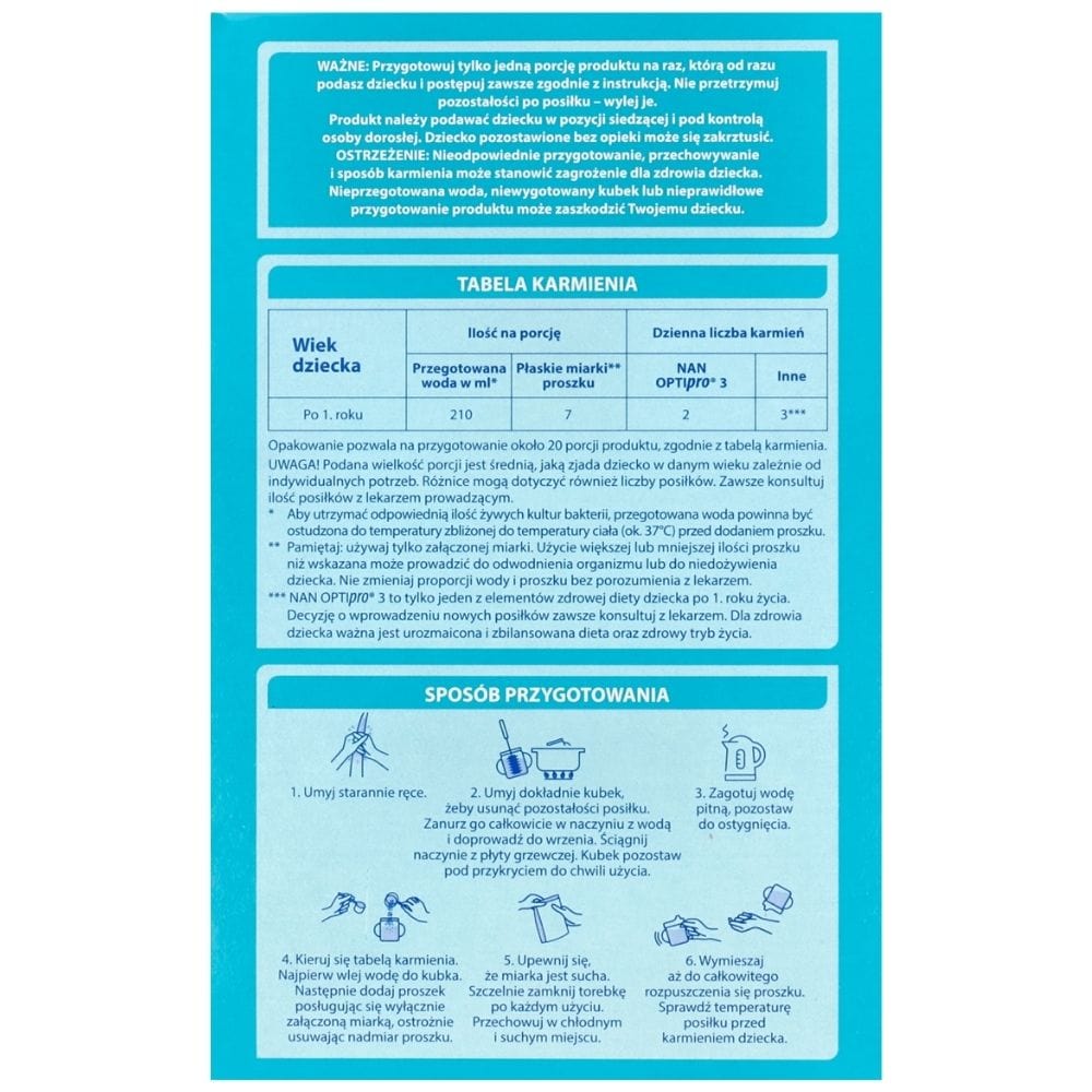 NAN OPTIpro 3 yra pieno pagrindu pagamintas produktas , skirtas mažiems vaikams. Praturtintas vitaminais ir mineralais. Tai nėra motinos pieno pakaitalas, bet produktas , sukurtas , turint omenyje vaikus, vyresnius nei 1 metų