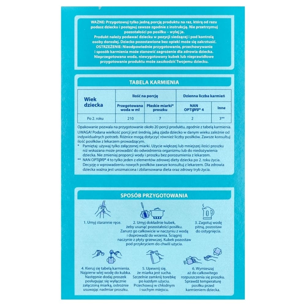 Nestle NAN OPTIpro 4 yra pieno pagrindu pagamintas produktas, skirtas vaikams nuo 2 metų. Praturtintas vitaminais ir mineralais. Tai nėra motinos pieno pakaitalas, bet produktas, skirtas palengvinti tinkamą vaiko mitybos sudėtį.
