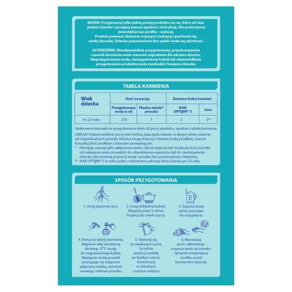 „Nestle NAN OPTIpro 5 “ yra pieno pagrindu pagamintas produktas, skirtas vaikams nuo 2,5 metų amžiaus. Praturtintas vitaminais ir mineralais. Tai nėra motinos pieno pakaitalas, bet produktas, skirtas palengvinti tinkamą vaiko mitybos sudėtį.