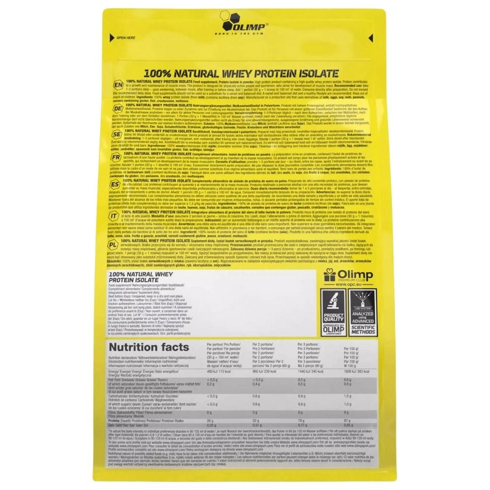 Olimp 100% natūralus išrūgų baltymų izoliatas yra natūralaus skonio maisto papildas miltelių pavidalo. Sudėtyje yra 100% išrūgų baltymų izoliato, be nereikalingų priedų ir užpildų.
