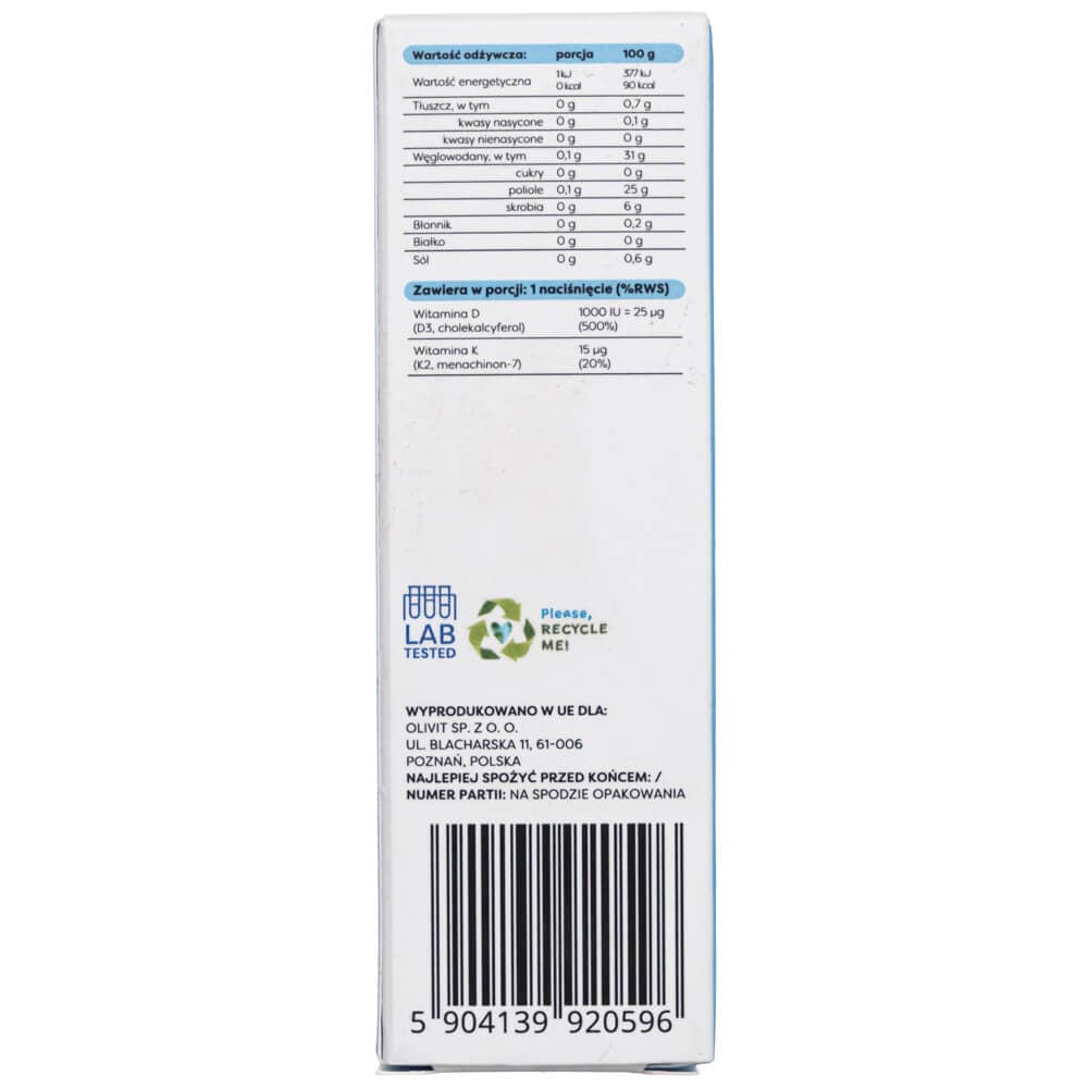Maisto papildas su vitaminu D3 (cholekalciferoliu) ir vitaminu K2 (menachinonu-7). Burnos purškiklis su ksilitoliu (saldikliais) ir natūraliu pipirmėčių aromatu.