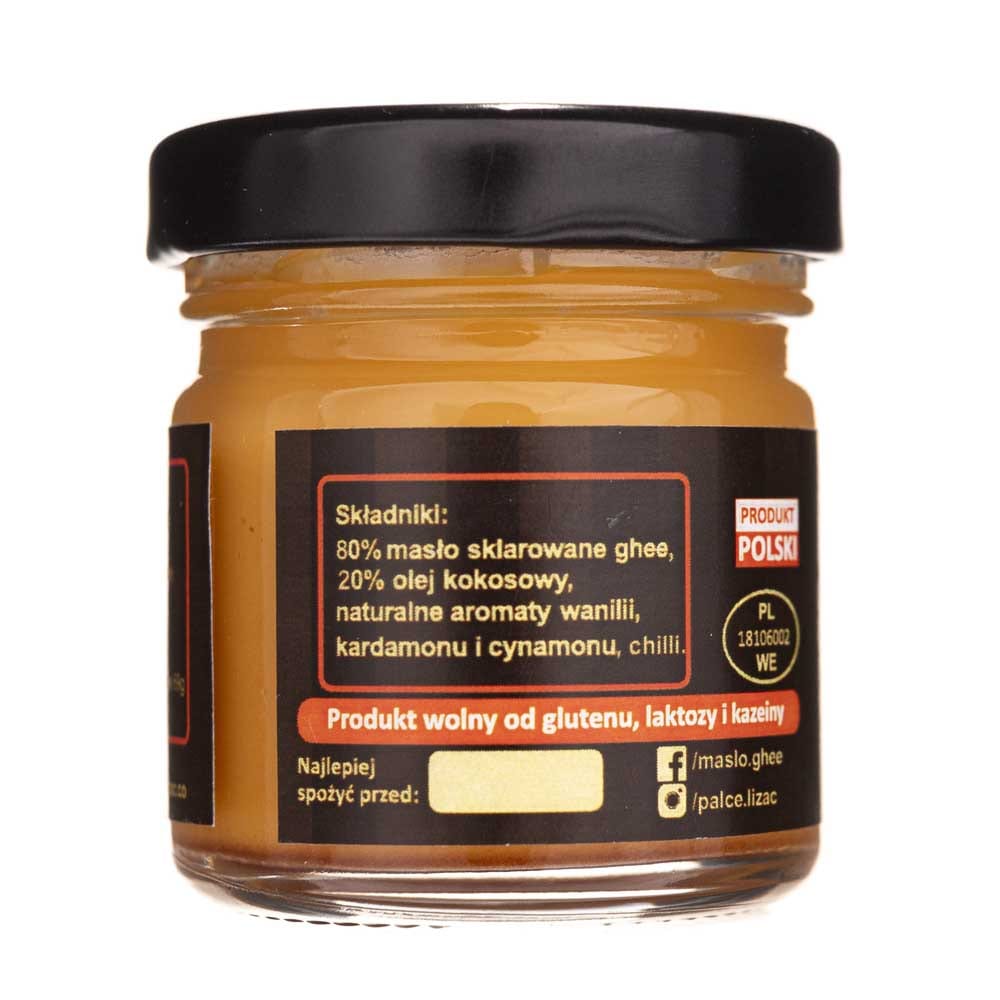 80% išvalyto ghi sviesto,20% kokosu aliejaus, naturaliu vaniles, kardamono ir cinamono, aitriuju papriku aromatu.