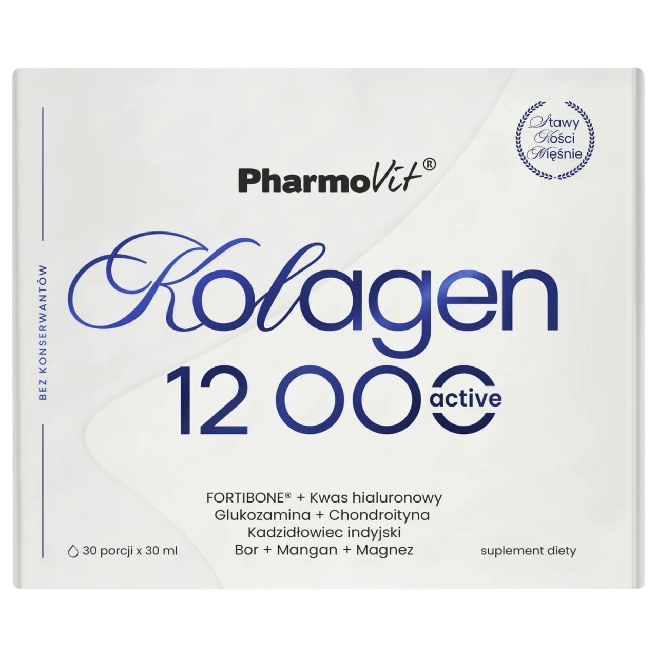 Pharmovit „Collagen 12000 Active“ yra skystos formos maisto papildas ( 30 ml ampulė ), kurioje yra hidrolizuoto galvijų kolageno ( 7000 mg ) ir FOR TiB ONE ® ( 5000 mg ) , gliukozamino ( 150 mg ) , chondroitino sulfatas ( 200 mg ) , hialurono rūgštis ( 50 mg ) ir MSM ( 200 mg ) . Vitaminas C ( 160 mg , 200 % RDA ) prisideda prie normalios kolageno gamybos, užtikrinančios normalią odos, kaulų ir kremzlių funkciją. Vitaminas D ( 1000 TV , 500 % RDA ) prisideda prie normalių kaulų palaikymo. Manganas prisideda prie normalios jungiamojo audinio formavimosi. Produktas skirtas suaugusiems. Vaisių skonis ( tropiniai vaisiai su citrinos prieskoniu ) . Sudėtyje nėra: dažiklių , želatinos , glitimo.