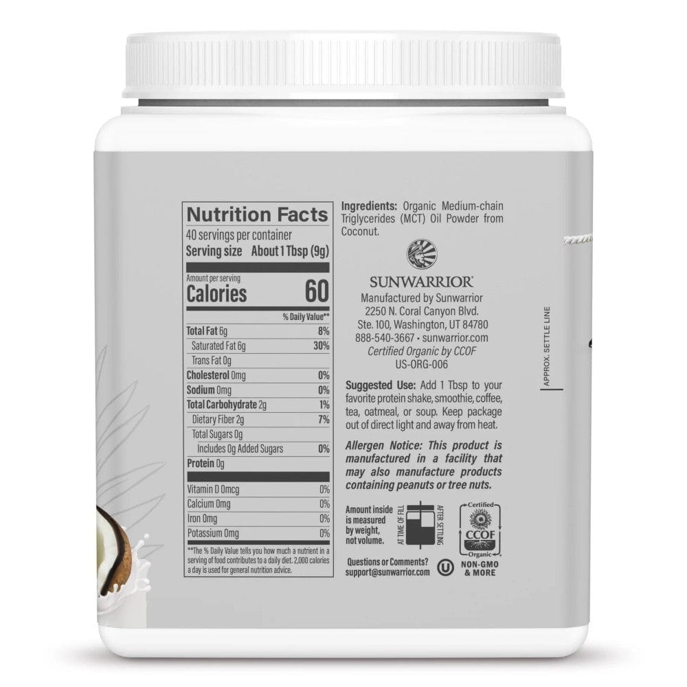 Sunwarrior Aktyvus MCT aliejus yra miltelių pavidalo formulė, kurios sudėtyje yra organinio kokosų aliejaus, miltelių pavidalo. Veganiškas, be nereikalingų priedų ir užpildų.