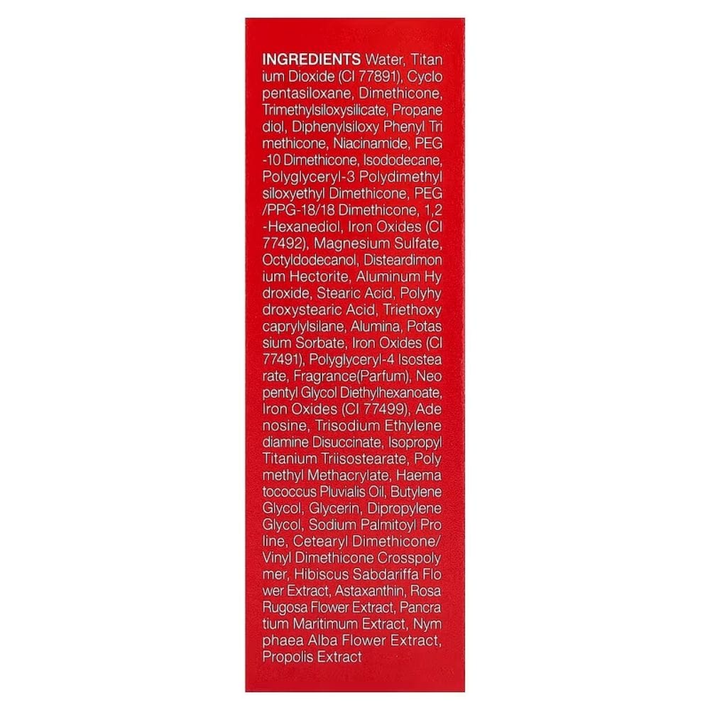 Vanduo, titano dioksidas (ci 77891), ciklopentasiloksanas, dimetikonas, trimetilsiloksisilikatas, propandiolis, difenilsiloksifeniltrimetikonas, niacinamidas, peg -10 dimetikonas, izododekanas, poligliceril-3 polidimetilsiloksietildimetikonas, peg /ppg-18/18 dimetikonas,1,2 -heksandiolis, geležies oksidai (ci 77492), magnio sulfatas, oktildodekanolis, disteardimonium hectorite, aliuminio hidroksidas, stearino rūgštis, polihidroksistearino rūgštis, trietoksikaprililsilanas, aliuminis, kalio sorbatas, geležies oksidai (ci 77491), poligliceril-4 izostearatas, kvapioji medžiaga (parfum), neopentilglikolio dietilheksanoatas, geležies oksidai (ci 77499), adenozinas, trinatrio etilen diaminas disukcinatas, izopropil titano triizostearatas, polimetilmetakrilatas, haematococcus pluvialis aliejus, butilenglikolis, glicerinas, dipropilenglikolis, natrio palmitoil pro linis, cetearil dimetikonas/vinil dimetikonas kryžminis polimeras, hibiscus sabdariffa flo wer ekstraktas, astaksantinas, rosa rugosa gėlių ekstraktas, pancra tium maritimum ekstraktas, nymphaea alba gėlių ekstraktas, propolio ekstraktas.